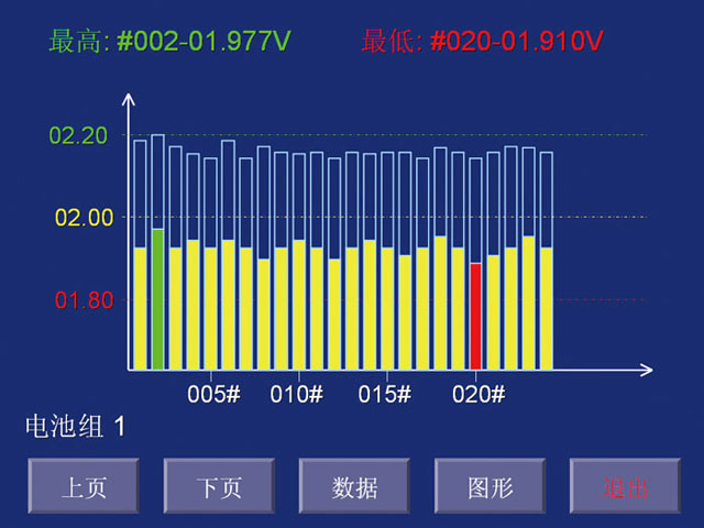 實時監測各單體數據,在主機屏幕上呈現出各單體電壓柱狀圖的變化軌跡,自動實時呈現出電壓最高與最低的單體。